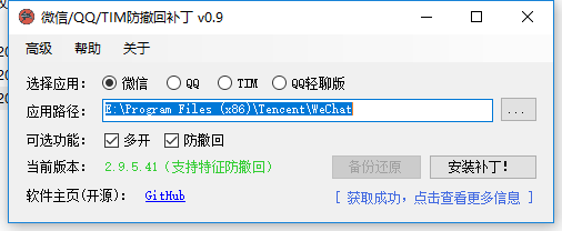 微信、QQ都一直使用的多功能防撤回补丁,撤回带提醒功能,本人长期使用无封号问题。附带了一个通用的微信多开工具,支持全版本微信的多开。说明本人只是转载非作者,软件上有原作者主页。
