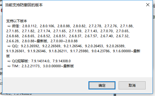 点击防撤回。界面可能会出现一段时间的无响应,请耐心等待。由于修改了微信的 WeChatWin.dll 文件、QQ/TIM的 IM.dll 文件,杀毒软件可能会弹出警告,放行即可。