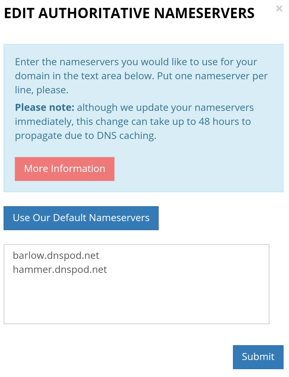 众所周知 dnspod是腾讯下免费提供的域名解析服务的,我们把域名dns解析到dnspod方便管理,记得把域名默认的dns改成dnspod为你生成的dns,下面是我的。