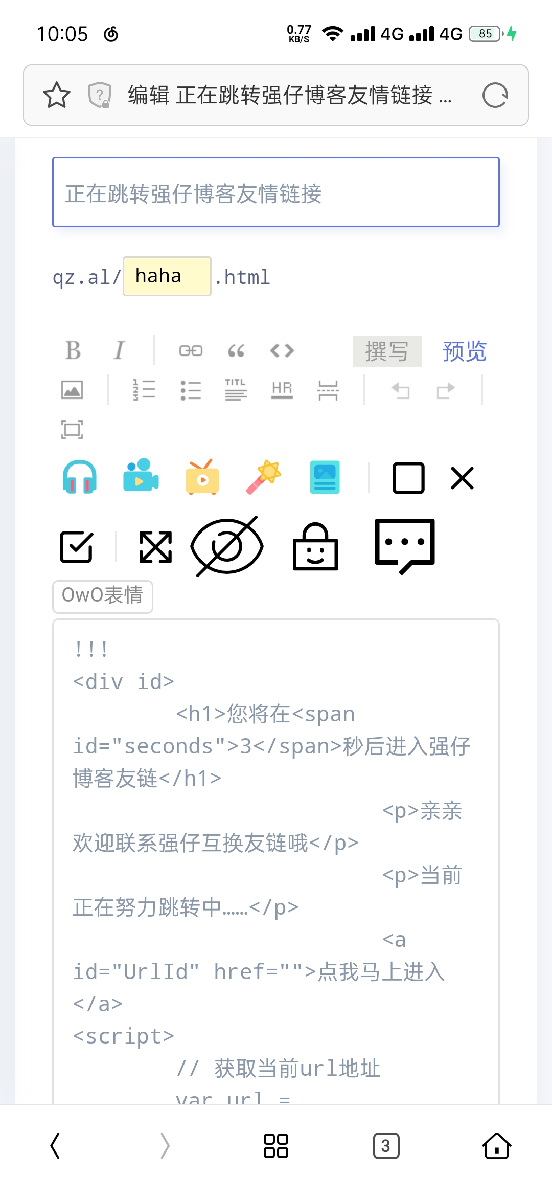 这里如果你的博客用了什么编辑器,就需要用到他们编辑器指定的页面规则,这里我用的md编辑器,当前如果要在文章页面里引入网页元素,就需要用 一对 !!! 把代码包起来