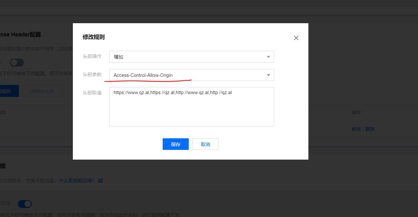 去腾讯CDN控制台设置,参数选择“Access-Control-Allow-Origin”取值可以设置“”,代表所有,就是对外开放,其他人也可以使用,如果不想别人使用那么就设置固定的域名,如图直接直接输入自己域名。