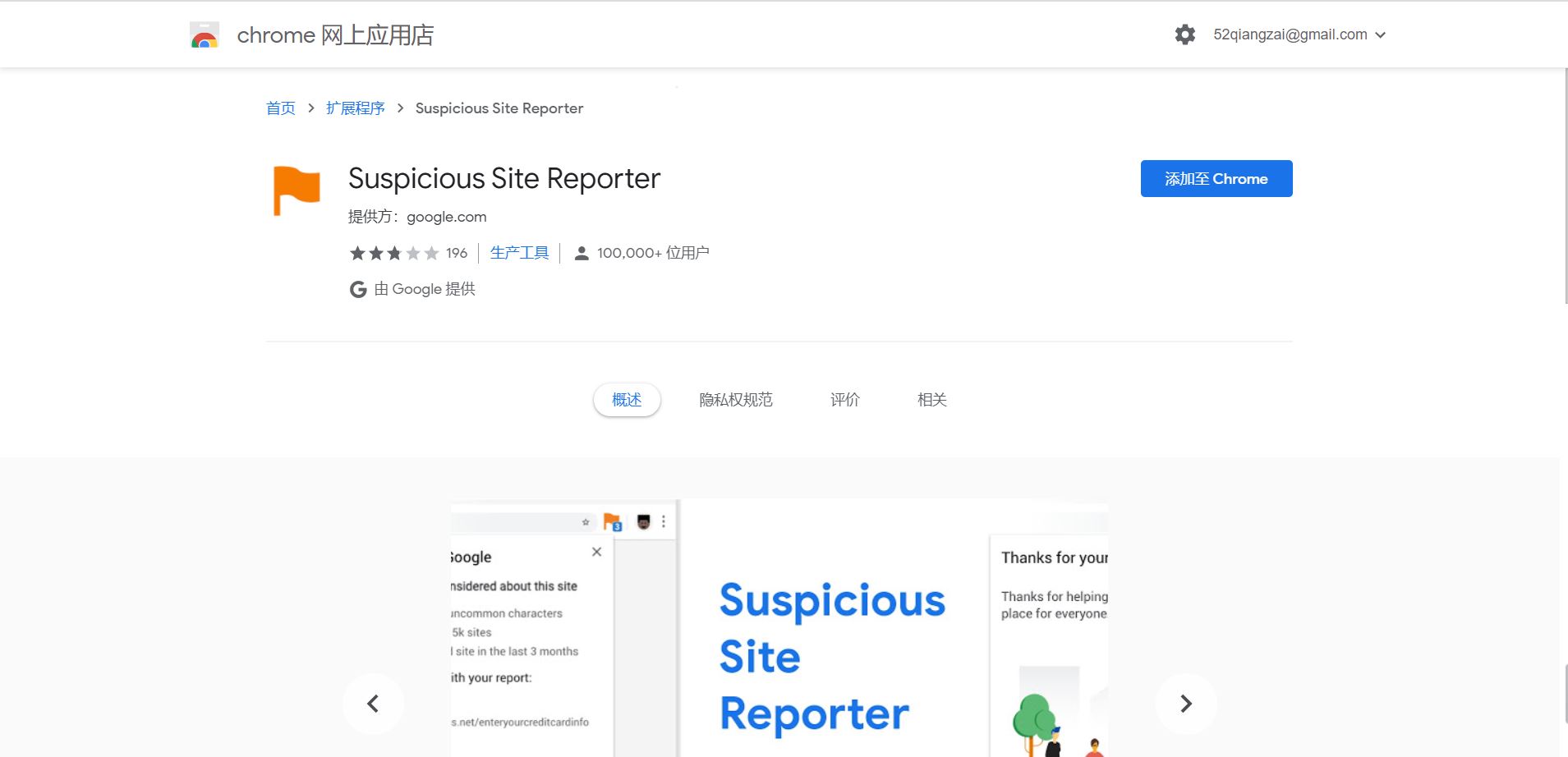 应用商店地址: https://chrome.google.com/webstore/detail/suspicious-site-reporter/jknemblkbdhdcpllfgbfekkdciegfboi