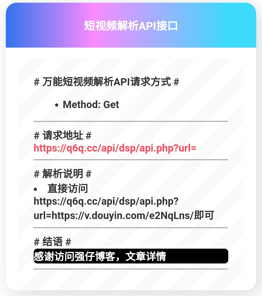 万能短视频无水印解析api,支持16个平台,访问api /?url= 加参数,等号后面加视频链接,回车访问即可返回 json数据 。图片演示点我进入测试代码下载网盘下载结语感谢访问强仔博客,希望本文对你有所帮助! API 分享到QQ 分享到空间 分享到微博 复制链接 4 5