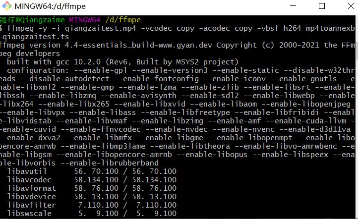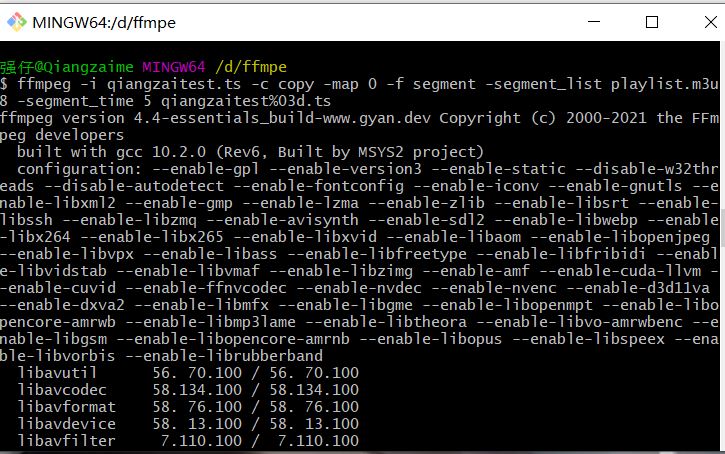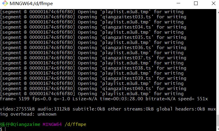 第一步:mp4转成ts格式,一对一转换,直接输入命令, qiangzaitest为视频文件名称