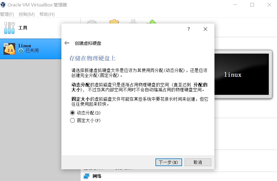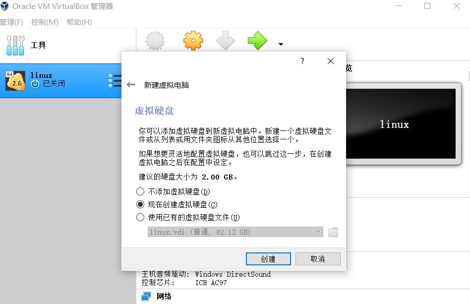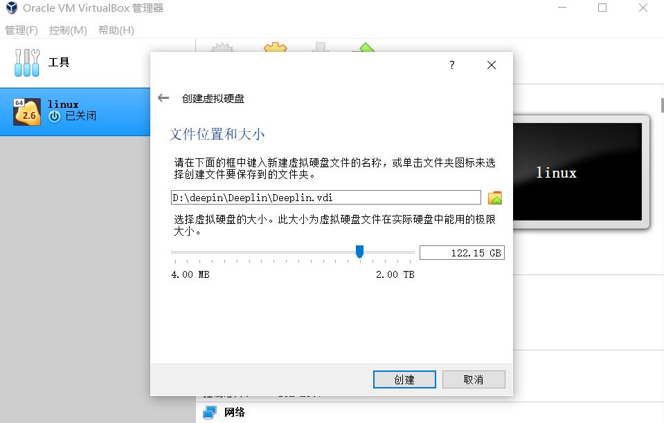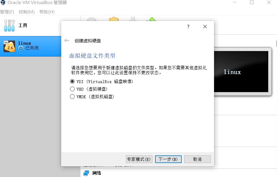 然后创建虚拟盘,VDI,动态分配,下面虚拟硬盘不要小于100G,因为第一次安装他提醒我安装就需要64G内存,害得我又重新安装一遍。