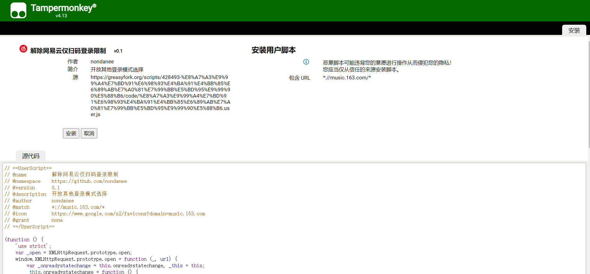最近网易云取消了正常的网页登陆,仅支持网页客户端app扫码登陆,虽然扫码登陆本身没有什么问题,但单方面的修改成这样,影响了用户web端体验,非常的不方便,所以今天分享利用脚本突破网易云音乐登录限制的脚本,安装以后支持第三方等更多登陆方式,同时歌单显示不全的也都可以完整查看!