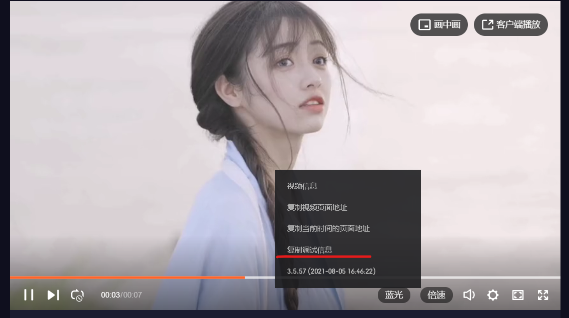 先上传一个视频,等待审核完毕,视频加载后,右键复制调试信息