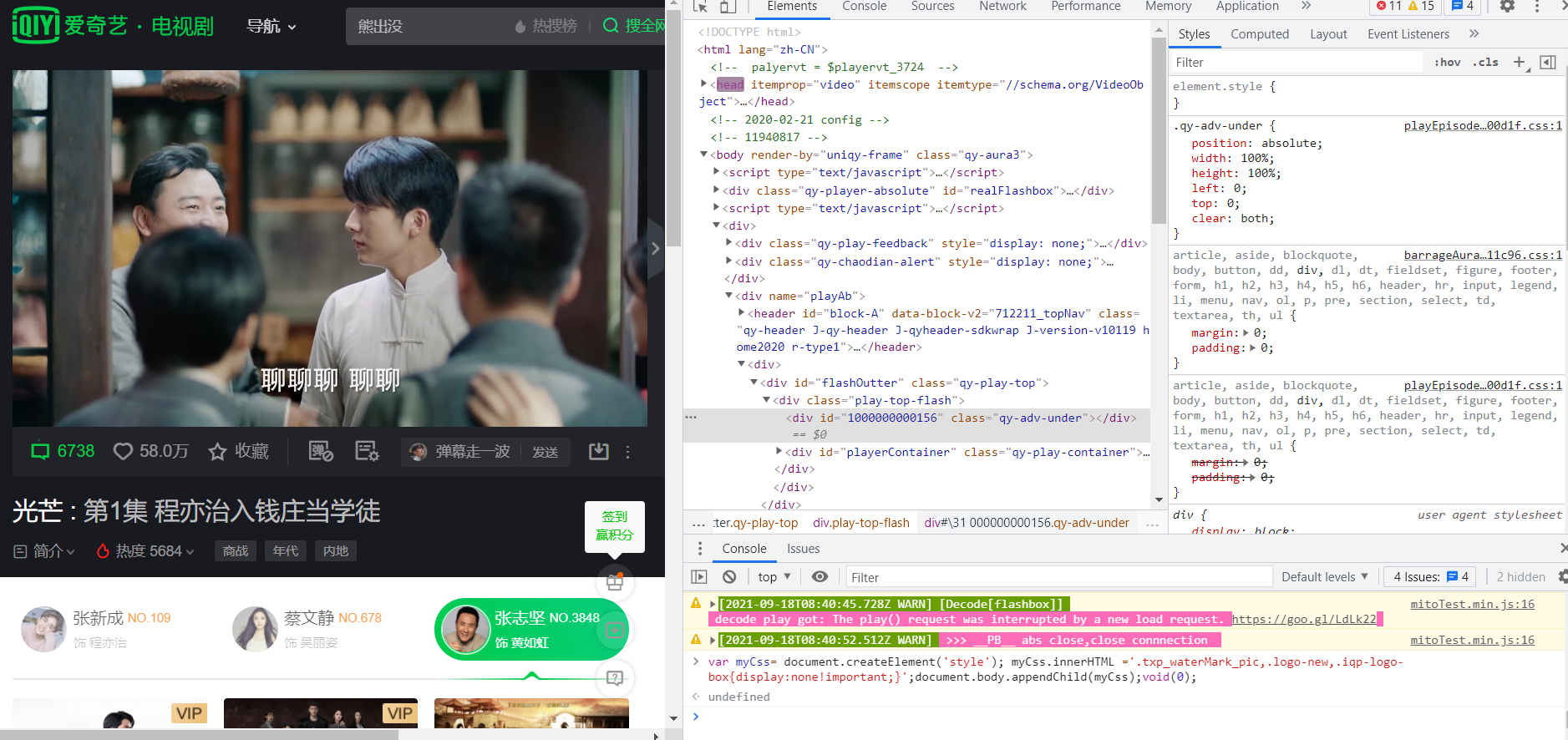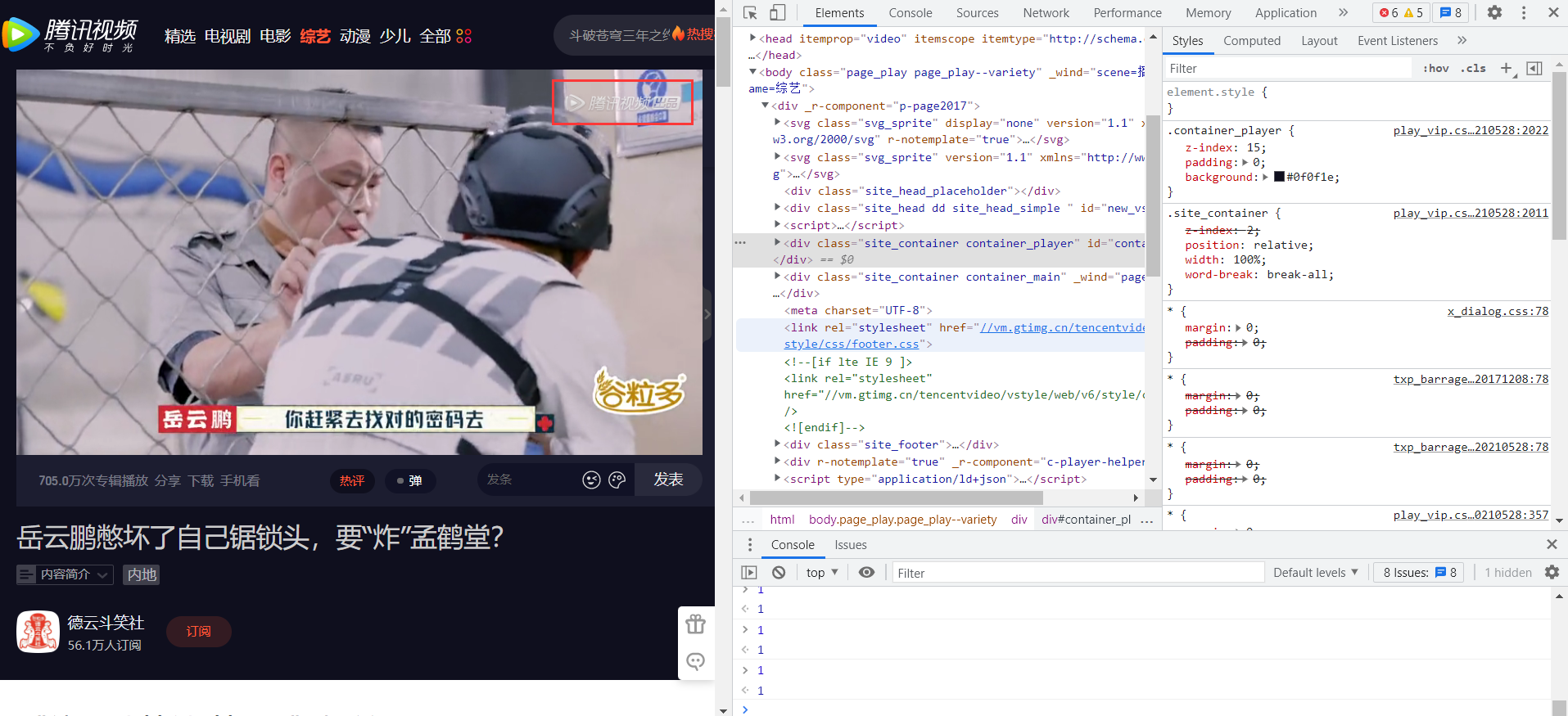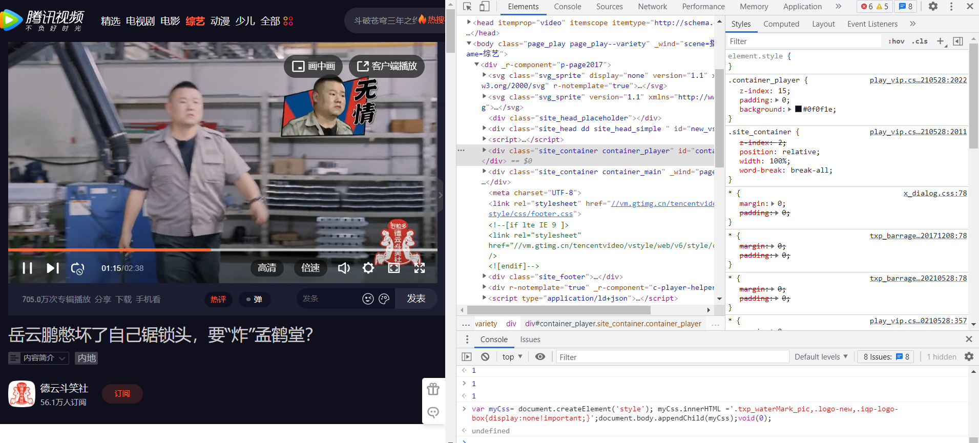 在浏览器要看视频时后,腾讯爱奇艺那些网站右上角总是显示他们的logo,看着碍事烦人,一串代码,在控制台执行即可去除,而且切换集数也不会出来LOGO!