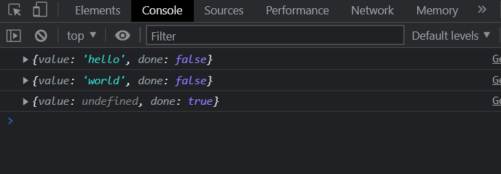 console.log(iterator.next()); // "{ value: 'world', done: false }"