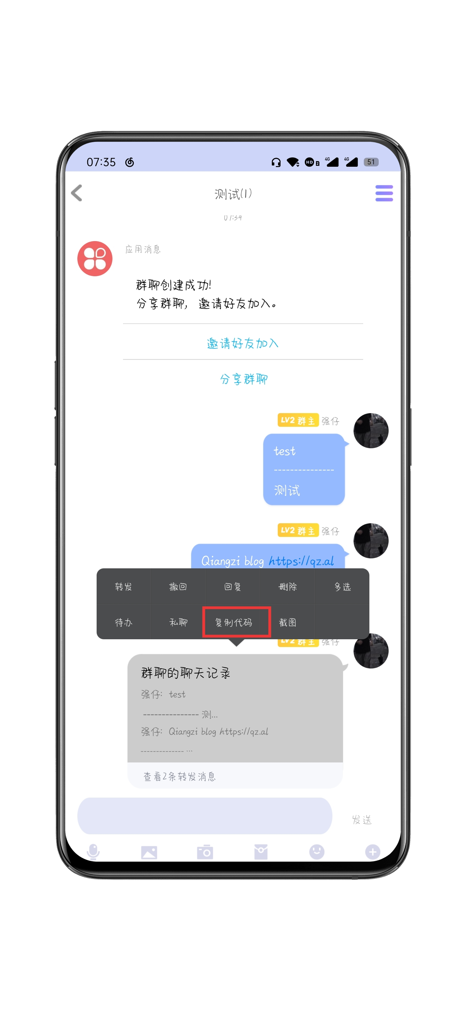 • 然后我们长按聊天记录,复制代码( 这一步需要你QQ在框架里运行而且使用了第三方模块,比如太极什么的,很简单的,联系大家去框架官网下载学习 )