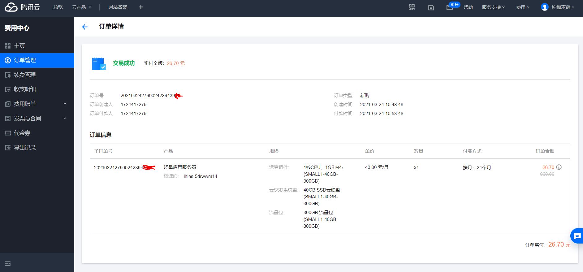 刚开始没咋子注意,直到今天上午,我随便上了 拾一 的车,领了一下,过了一会看见 拾一 在群里发低价撸了两年服务器,好家伙,这直接吸引了我这位资深老白嫖怪,在拾一的一番讲解,成功26.7撸了两年1h1g3m的北京轻量服务器,另一个优惠券能20买8个月香港,我没用,送朋友了。还真别说,真香!