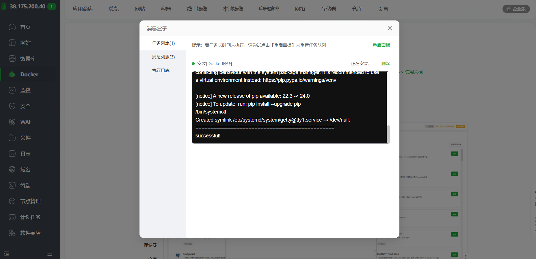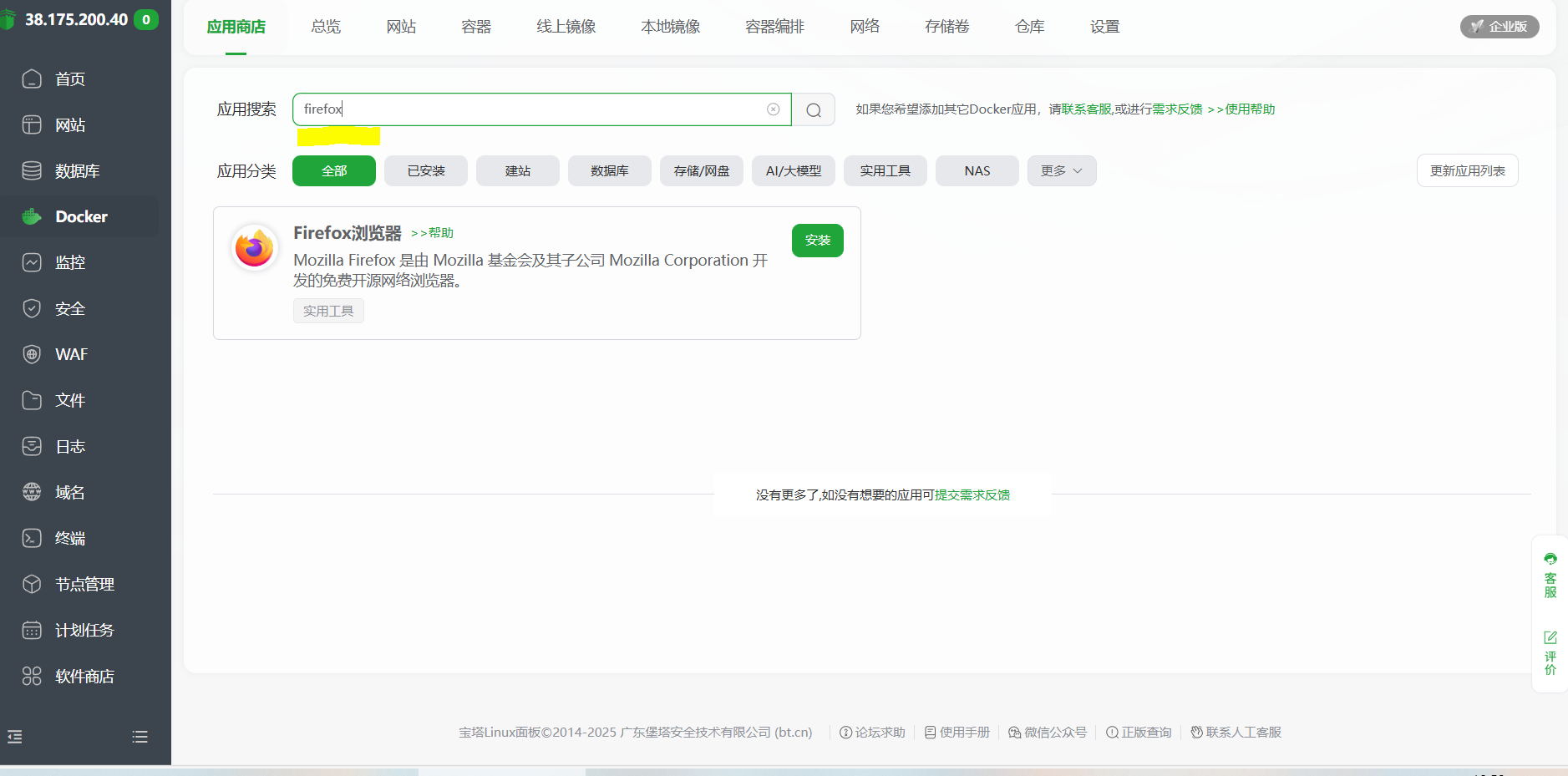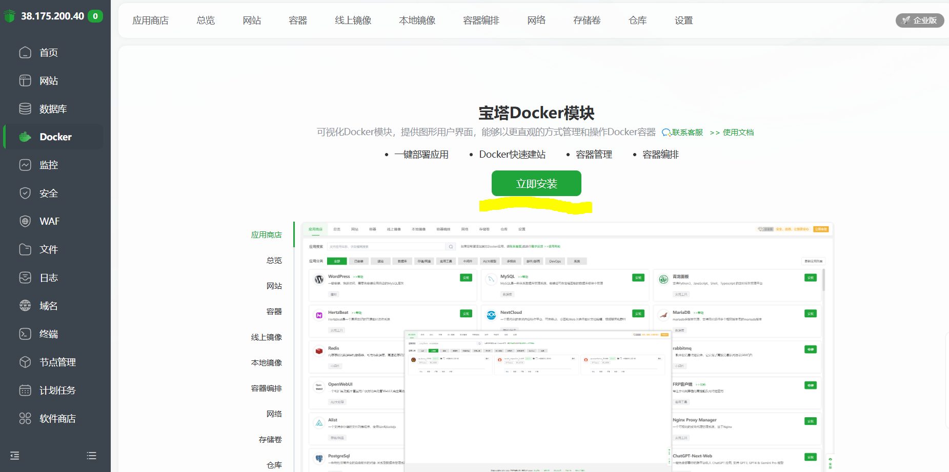 用我这台日本的bgp服务器为例,我们安装宝塔可视化面板后,进入并安装Docker页面,没有安装的可以提前进行Docker安装。该说不说,这一点宝塔对于我们这些不是那么擅长用命令的操作linux用户还是挺友好的