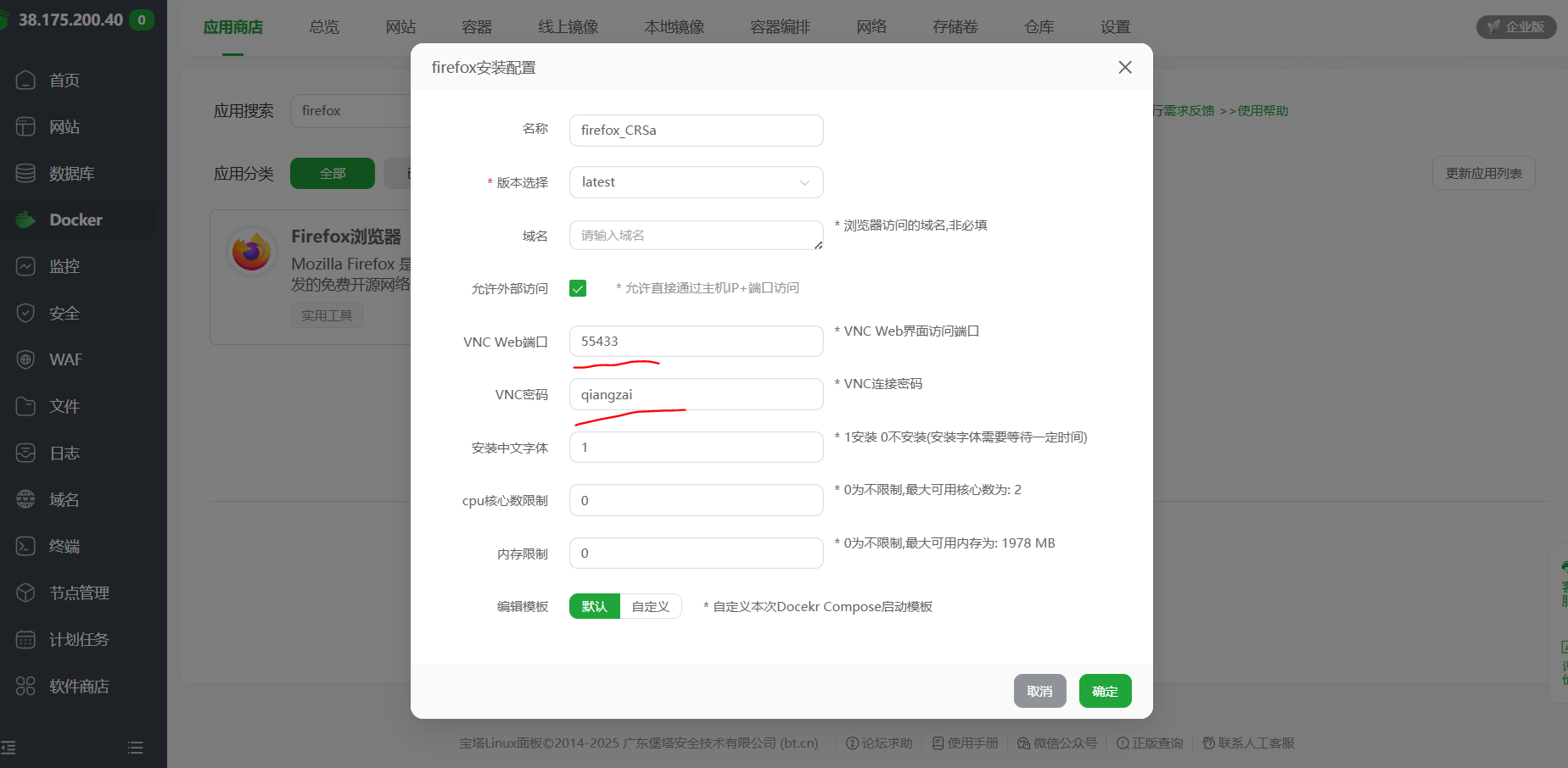 到这一步想必大家就知道了,没错就是用我们的docker容器安装一个firefox浏览器,进行端口连接VNC访问,大家怕是也没想到Docker竟然还能安装浏览器吧~