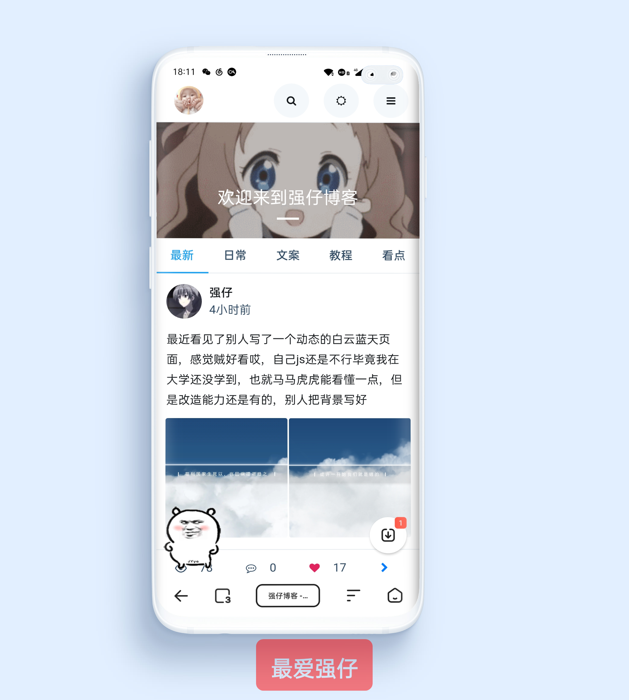 网站炫彩挂件装修代码 分享一个网站炫彩挂件装修代码可自定义图片,感觉很可爱的,自定义自己喜欢的图片,自我感觉超级滑稽!代码 <style> .qz { position: fixed; z-index 强仔 08-23 1583 0